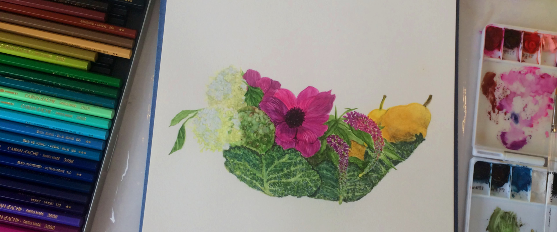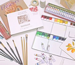 「Noriko Art Salon クラス Lesson」では、主に透明水彩絵の具、その他に鉛筆、パステル、顔料系インク等を使用して作品を制作していただいております。